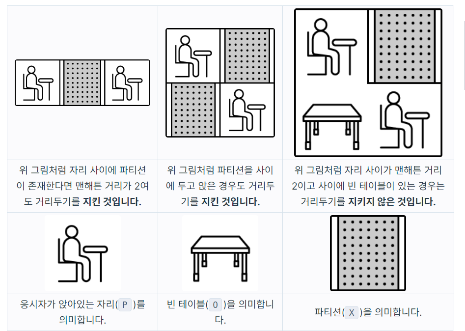 개발자를 희망하는 죠르디가 카카오에 면접을 보러 왔습니다.코로나 바이러스 감염 예방을 위해 응시자들은 거리를 둬서 대기를 해야하는데 개발 직군 면접인 만큼아래와 같은 규칙으로 대기실에 거리를 두고 앉도록 안내하고 있습니다.