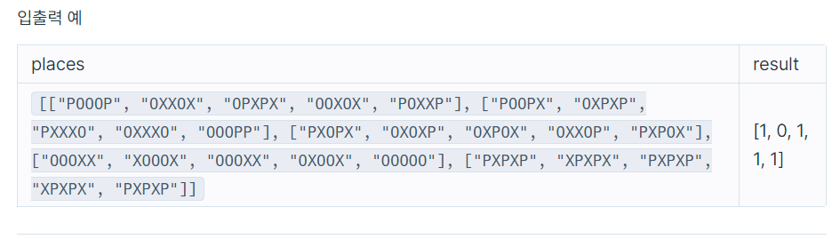 places의 행 길이(대기실 개수) = 5places의 각 행은 하나의 대기실 구조를 나타냅니다.places의 열 길이(대기실 세로 길이) = 5places의 원소는 P,O,X로 이루어진 문자열입니다.places 원소의 길이(대기실 가로 길이) = 5P는 응시자가 앉아있는 자리를 의미합니다.O는 빈 테이블을 의미합니다.X는 파티션을 의미합니다.입력으로 주어지는 5개 대기실의 크기는 모두 5x5 입니다.return 값 형식1차원 정수 배열에 5개의 원소를 담아서 return 합니다.places에 담겨 있는 5개 대기실의 순서대로, 거리두기 준수 여부를 차례대로 배열에 담습니다.각 대기실 별로 모든 응시자가 거리두기를 지키고 있으면 1을, 한 명이라도 지키지 않고 있으면 0을 담습니다.